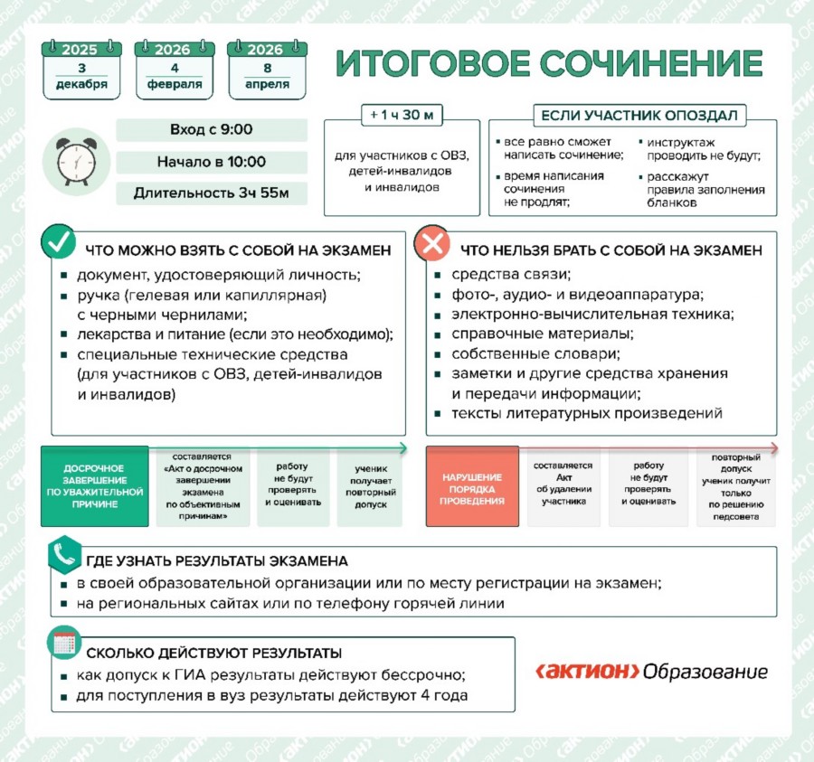 Обучающиеся, получившие неудовлетворительный результат («незачет»), не явившиеся на итоговое сочинение (изложение) или не завершившие его написание по уважительным причинам смогут написать сочинение в дополнительные сроки – первая среда февраля или в апреле.